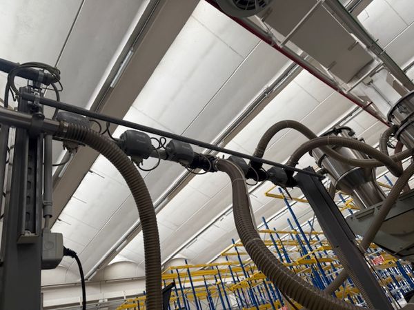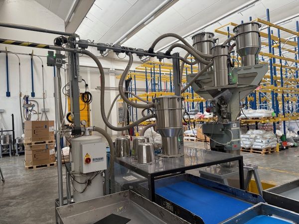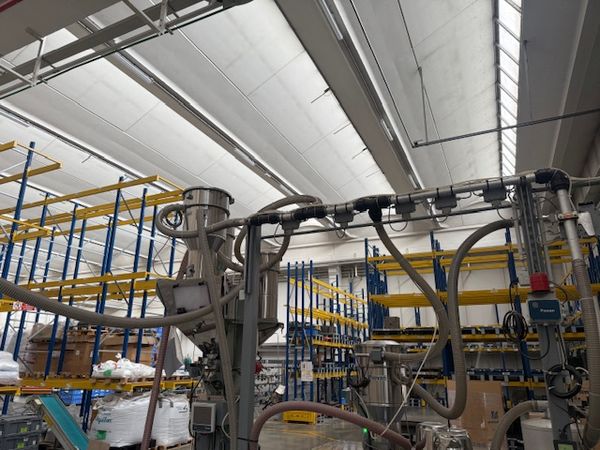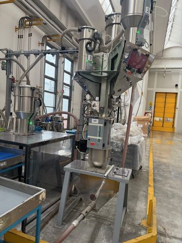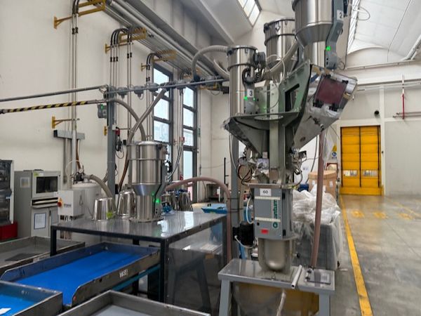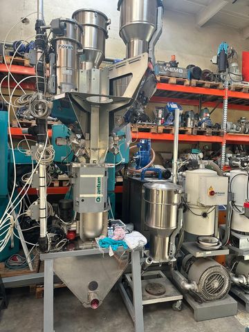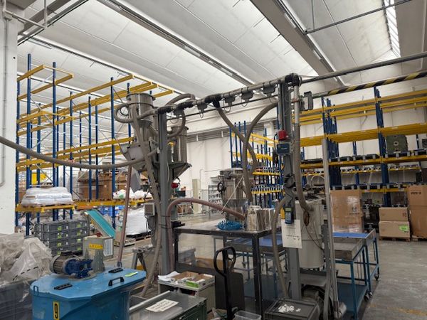 | Grawimetryczny system dozowania i mieszania tworzywa i barwników z 3 zbiornikami Urządzenia wchodzące w skład systemu: Dozownik grawimetryczny z wagą i mieszalnikiem, urządzenia bardzo precyzyjne System sterowania: Piovan Easy3 3x podajnik podciśnieniowy C30 1x podajnik podciśnieniowy C10 Odbiór gotowej mieszanki następuje za pomocą podajnika podciśnieniowego Piovan C30 System posiada swoje zasilanie, pompa F48/2 o mocy 4,5 kW Własna filtracja i oczyszczanie z pyłów |